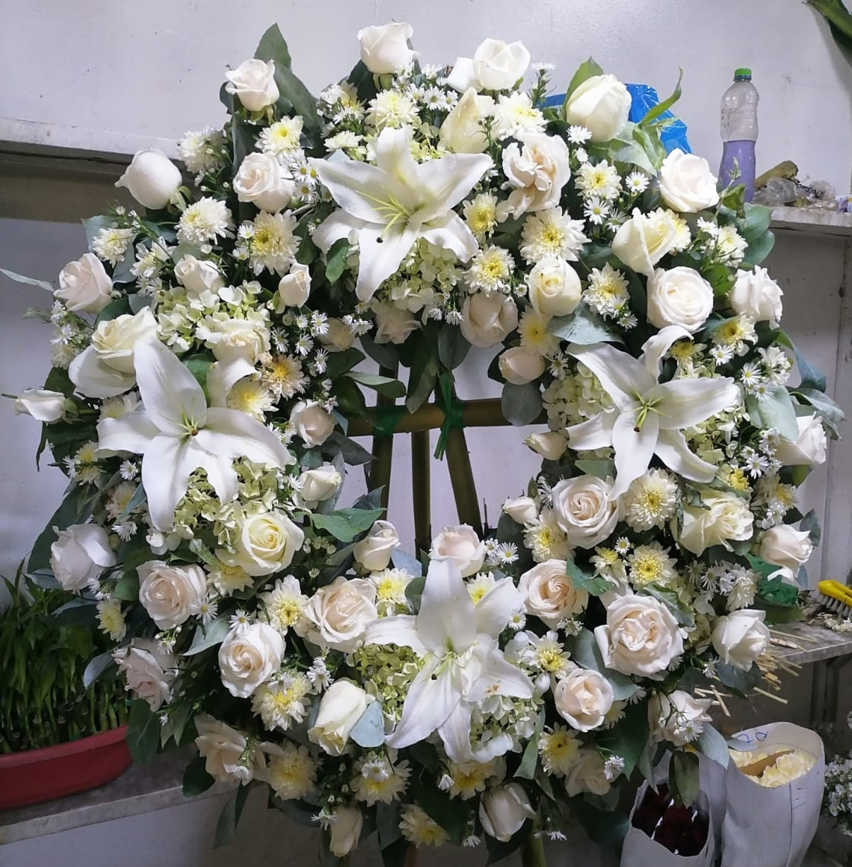 Corona de Liliun y Rosas Blancas y Pompones