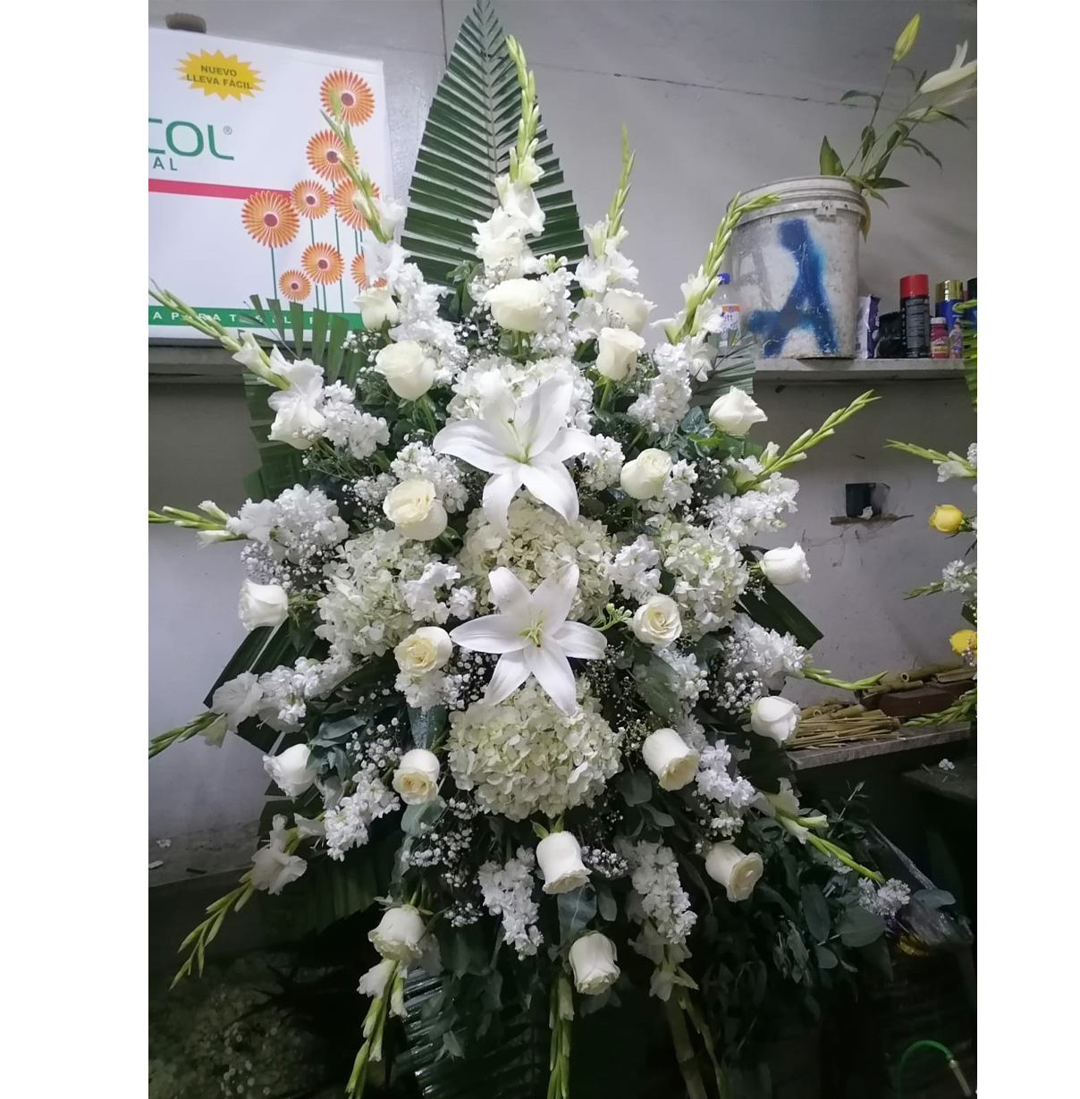 Trípode Fúnebre de Rosas Blancas, Liliun, Gladiolos, Ortencias y Follajes